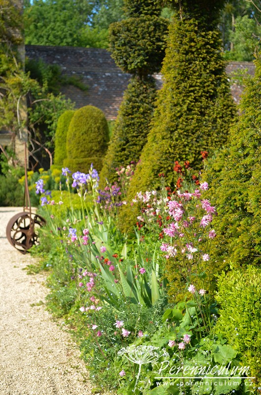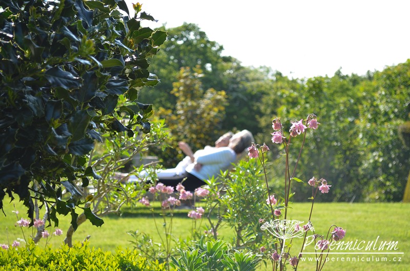 Shodou okolností jsem se hned druhý den po této velkolepé londýnské výstavě vypravila navštívit soukromou zahradu, která otevírá jen dvakrát do roka, Hanham Court. Právě tady, v přímé konfrontaci, jsem si uvědomila ten obrovský rozdíl. Už jen to, že se člověk neprodírá davy lidí u vstupu, ale následně pak i zahrada, která Vám jednoduše vezme dech, ačkoli není perfektní. Hanham Court najdete u hloubi poklidného anglického venkova, kde se pasou odrostlá jehňata a je cítit koňské koblihy. Už od vchodu je skrz otevřená dřevěná vrata vidět velká část reprezentativní zahrady - dlouhý pás nízce střiženého trávníku lemovaný šachovými figurkami z tisu s bohatými trvalkovými podsadbami. Zdá se jakoby se táhl do nekonečna, ve skutečnosti ale končí terénním schodem, opěrnou zídkou, od které utíká dolů do údolí malebná květnatá louka a dál krajina venkova. Tomu se mezi zahradními architekty říká "vypůjčená krajina", jelikož není součástí vaší zahrady, ale díky nepřerušeným výhledů, jakoby k zahradě patřila.