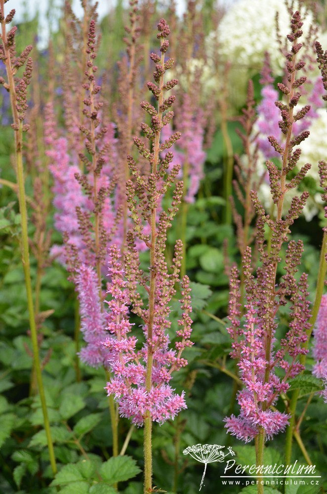 Astilbe chinensis pochází z východní Číny, Mongolska a Korei, kde obvykle roste ve vlhkých lesích či podél přistíněných potoků. Jedná se o poměrně variabilní druh, který silně odnožuje, rozrůstá se. Listy jsou dělené, dlouze řapíkaté, lístky jsou krátce řapíkaté, kopinaté, ostře dvojitě pilovité, sytě zelené. Nejen řapíky, ale také vzpřímené stonky tyčící se nad masou listů, jsou zabarvené do vínova či tmavě hněda v závislosti na stanovišti. Astilbe chinensis se velmi dobře pozná podle toho, že celá rostlina je rezavě chlupatá.