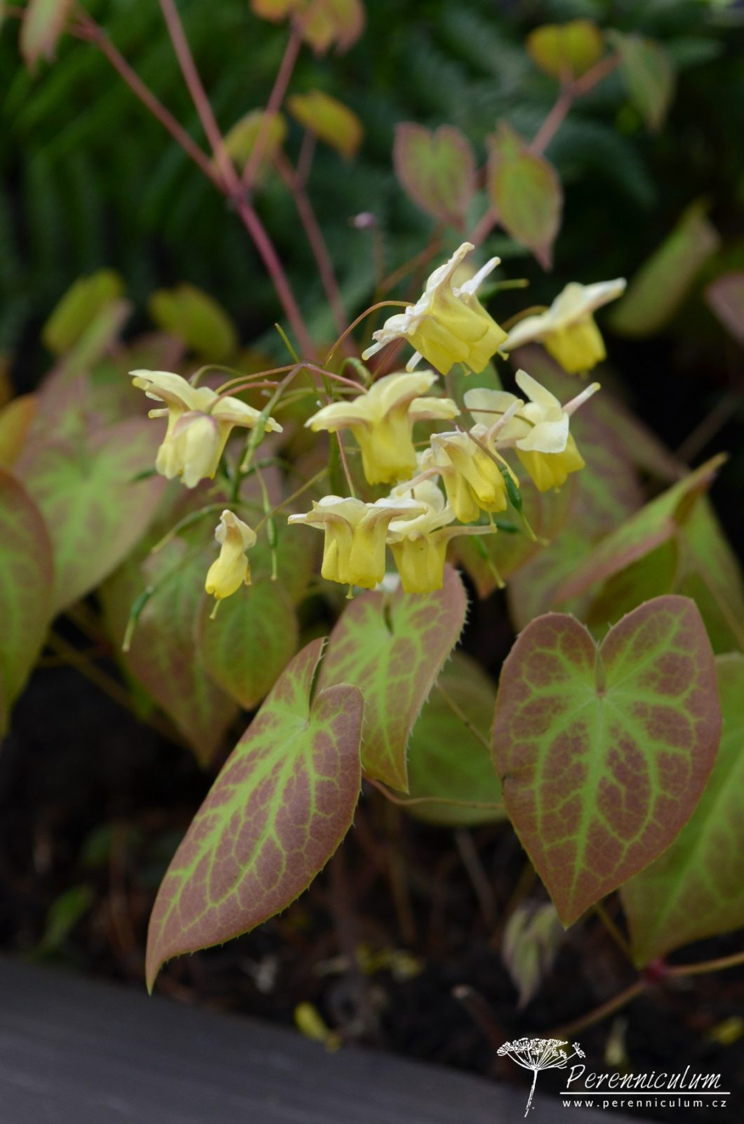 Epimedium × versicolor je velmi variabilní druh, jehož listy mohou být stálezelené i opadavé a mohou se skládat z 3, 5, 9 nebo více lístků. Listy jsou obvykle měděně červené při rašení, později mají hnědočervenou kresbu. Tenké květní stonky nesou až 20 květů, které jsou až 2 cm široké a obvykle sterilní. Vnější, kališní plátky jsou skoro stejně dlouhé jako vnitřní korunní, které mají středně dlouhou ostruhu. Dosahuje výšky okolo 30 cm.